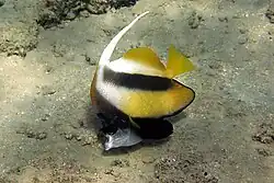 Heniochus intermedius[3] – gatunek morskiej ryby z rodziny chetonikowatych. Bywa hodowana w akwariach morskich. Charakterystyczny jest żółty brzuch oraz biała płetwa grzbietowa z długim filamentem.