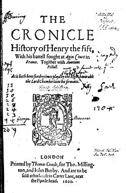 Istnieje przekaz, mówiący o tym, że Henryk V był inscenizowany w 1599 roku, nie ma na to jednak dowodów. Najstarsze znane, udokumentowane przedstawienie miało miejsce w 1605 roku. Obecnie kronika ta należy do najczęściej inscenizowanych dzieł Szekspira, choć w Polsce dramat bywa grany bardzo rzadko.