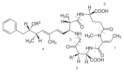 - ↑ Lisa Spoof, Arnaud Catherine, Appendix 3. Tables of Microcystins and Nodularins, [w:] Handbook of Cyanobacterial Monitoring and Cyanotoxin Analysis, Jussi Meriluoto, Lisa Spoof, Geoffrey A. Codd (red.), 2017, s. 526–537, DOI: 10.1002/9781119068761.app3 (ang.).