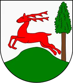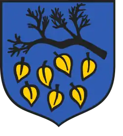 Herb przedstawia złamaną gałąź z siedmioma opadającymi liśćmi koloru złotego na niebieskim tle.
