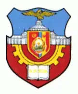 Tarcza herbowa jest koloru niebieskiego. Na niej znajduje się złoty orzeł z krzyżem łacińskm w dziobie, trzymający w szponach: po prawej stronie miecz, zaś w lewej berło. Poniżej na trójkolorowej (czerwono-żółto-niebieskiej) wstędze odwołującej się do barw Rumunii, zawieszonej na ogonie znajduje się motto: PATRIA ȘI DREPTUL MEU (Moja Ojczyzna i Prawo).