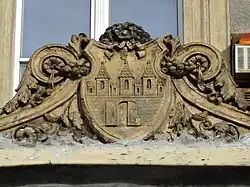W polu srebrnym mur miejski czerwony z blankami, z bramą i trzema basztami, z których środkowa wyższa i większa, w każdej baszcie po jednym oknie łukowym, czarnym. Na basztach dachy niebieskie, zakończone gałkami złotymi. Na gałce dachu baszty środkowej wietrznik złoty zwrócony w prawo. W murze brama z broną złotą podniesioną; prawe podwoje otwarte; otwór bramny srebrny, podwoje niebieskie, okucia podwoi złote”.