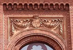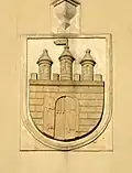 Szczególnie ciekawy jest herb umieszczony na bordiurze jednej z kart Księgi. Miniatura ukazuje nam złoto obramowaną tarczę o błękitnym polu, zwieńczoną również złotą otwartą koroną królewską. Sam herb przedstawia czerwony mur miejski o pięciu blankach z bramą, której heraldycznie prawe skrzydło jest otwarte. Ościerza bramy obudowane białym kamieniem, wrota w kolorze złotawym, deski ułożone w jodełkę, w otworze bramnym widać podniesioną bronę. Po obu stronach wrót umieszczono strzelnice tzw. kluczowe. Ponad murem wyrastają trzy, jednakowej wysokości, okrągłe wieże zwieńczone blankowaniem. Każda z wież opatrzona została w dwa ciągi otworów strzelniczych; ciąg górny – po dwa okienka, ciąg dolny – po jednym okienku. Spoinowanie wykonano białą farbą. Dodatkowym elementem są fragmenty drzew wystające ponad mur miejski. Opisany tu herb wykonany prawdopodobnie został w końcu XVII stulecia, lecz stał się wzorem do naśladowania na kolejnych kartach Księgi Królów Kurkowych.
