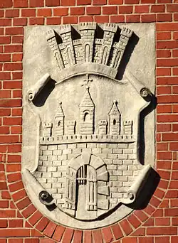Pierwszy z nich przedstawiał mur miejski z bramą, której prawa połowa jest otwarta. W prześwicie bramnym widać podniesioną bronę. Mur z cegły, zwieńczony czterema blankami i trzema basztami, w każdej z nich otwór strzelniczy. Wieże nakryte dachami namiotowymi zakończonymi krzyżami równoramiennymi (wieże skrajne) i łacińskim (baszta środkowa). Wieża środkowa, wyższa niż boczne, ma nadto przytwierdzoną do krzyża chorągiew dachową zwróconą w prawo.