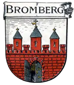 W XIX wieku, pomimo nadal obowiązującego wzorca, różnice w szczegółach herbu nasiliły się, o czym świadczą rysunki z lat 1828 i 1830. W rysunkach pojawiają się już złota korona i most zwodzony, na murze obronnym brak blankowania, deski we wrotach bramy ułożone zostały pionowo. Rysunki pozbawione są cech heraldycznych, zastosowane barwy odpowiadają kolorom naturalnym. Z okresu pruskiego, dokładniej z roku 1796, posiadamy nową pieczęć wyobrażającą ceglany mur miejski zwieńczony blankami, w którym umieszczono bramę z otwartą heraldycznie prawą połową wrót. Wrota zawieszono na dwu parach zawiasów zakończonych wąsami, zbudowano je z desek ułożonych w jodełkę. Znad muru wyrastają trzy wieże jednakowej wysokości, w każdej z nich po jednym prostokątnym okienku. Namiotowe dachy wież, kryte dachówką karpiówką, zwieńczono kulami, natomiast wieża środkowa posiada dodatkowo maszt zakończony krzyżem, na którym powiewa chorągiewka zwrócona w heraldycznie prawą stronę. Oryginał papierowo-woskowego odcisku o średnicy 47 mm opatrzono w górnej części rysunku półokrągło rozmieszczonym napisem: „SIEGEL DER KONIGL: PREUSS: STADT” poniżej zaś, poziomo, dodano: „BROMBERG”.