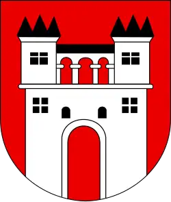 Herb przedstawia w polu czerwonym blankowany mur srebrny z trzema takimiż wieżami, z których środkowa wyższa od pozostałych. Każda z wież ma po jednym oknie łukowym. Mur z bramą, z otwartymi srebrnymi podwojami i podniesioną złotą broną, okucia podwoi czarne.