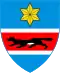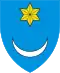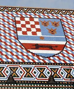 tarcza z szachownicą, zawiera czerwone i białe pola a nad nią znajdują się historyczne herby chorwackie |