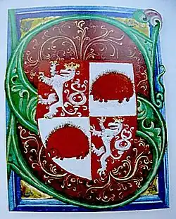 Ma postać czwórdzielnej tarczy: w polu pierwszym i czwartym na czerwonym tle znajduje się ukoronowany srebrny lew; w polu drugim i trzecim na srebrnym tle widnieje czerwony jeż.