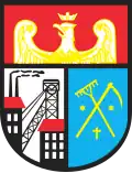 Herb przedstawia na tarczy gotyckiej trójdzielnej: w polu pierwszym, czerwonym biały orzeł dzielony w pas, ze złotą otwartą koroną na głowie oraz złotym orężem, zwrócony w prawo. W polu drugim, białym czarna kopalniana wież wyciągowa, obok dwa budynki fabryczne czarne nakryte czerwonymi spadzistymi dachami z dwoma oknami każdy. W polu trzecim błękitnym są skrzyżowane: kosa i grabie zwrócone ku górze, po bokach dwie gwiazdy, u dołu krzyż łaciński, wszystko barwy złotej.