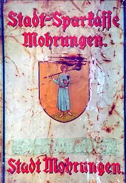 Od XVI w. miasto używało herbu przedstawiającego postać osoby czarnoskórej w fartuchu, z kijem na plecach, na tle gwiaździstego nieba. Taka interpretacja herbu wynikła z przypadkowej zbieżności nazwy miasta ze słowem Mohr, znaczącym w języku niemieckim „Murzyn”. W tym czasie prawdziwa geneza herbu była zapomniana.