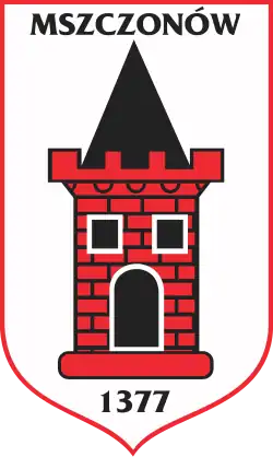 Do 2020 r. gmina używała herbu w postaci czerwonej wieży mieszkalno-obronnej z czarnym stożkowatym dachem. Nad wieżą widniał czarny napis MSZCZONÓW, a pod nią liczba 1377 – rok uzyskania praw miejskich. Wizerunek herbowy nawiązywał do herbu miasta z XVII wieku[3].