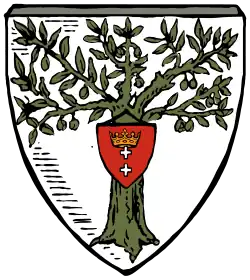 In Silber ein grüner, früchte tragender Olivenbaum, an dessen Stamme der Schild des Danziger Staats- und Stadtwappens aufgehängt ist.