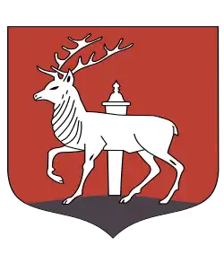 Herb przedstawia na tarczy w polu czerwonym kroczącego srebrnego jelenia na zielonej murawie, za nim suche drzewo, a przed nim drzewo z liśćmi[2][3].