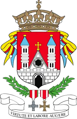 Herb przedstawia na czerwonej tarczy herbowej, w części dolnej, mur obronny z otwartą bramą, a w górnej – fronton katedry z czarną rozetą zwieńczonej złotym krzyżem i dwiema wieżami ze stożkowymi niebieskimi dachami ozdobionymi złotymi kulami.
