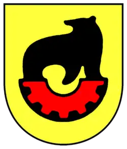 W polu zielonym niedźwiedź brunatny ze złotą okszą na lewym barku, kroczący na tylnych łapach[1].