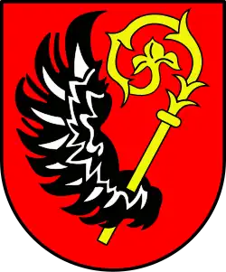 Herb przedstawia w polu czerwonym skrzydło orle ze złotą przepaską i pastorał złoty przekrzyżowane u podstawy[1].