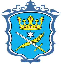 Herb przedstawia na błękitnej tarczy złotą koronę a pod nią gwiazdę sześcioramienną nad skrzyżowanymi liściem palmy leżącym na mieczu. Miecz i liść są połączone wstęgą.