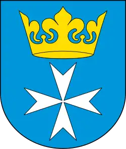 Herb przedstawia na tarczy w polu czerwonym nad srebrnym krzyżem maltańskim miecz srebrny ze złotą rękojeścią na opak przekrzyżowany dwoma kluczami złotym i srebrnym zębami do góry[2].