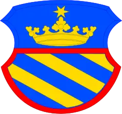 Herb przedstawia na tarczy w polu czerwonym trzy koła wodne srebrne (2 nad 1), pomiędzy którymi, pośrodku, korona złota otwarta o czterech kwiatonach, nad którą takaż gwiazda. Całość na tarczy typu hiszpańskiego[1].