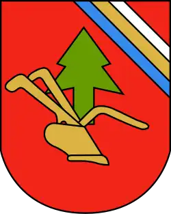 W latach 1992–2022 gmina posługiwała się herbem wyobrażającym pług w złotym kolorze i drzewo iglaste w kolorze zielonym na czerwonym tle[3]. Z boku znajdowały się trzy pasy w kolorach białym, oznaczającym czyste powietrze, żółtym, oznaczającym złote łany zbóż oraz niebieskim symbolizującym czystą wodę[3][4]. Herb ten nie miał żadnego umocowania w tradycji historycznej gminy, nawiązywał tylko do walorów przyrodniczo-krajobrazowych.