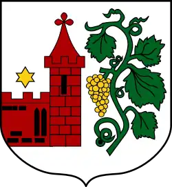 Herb przedstawia na tarczy w polu srebrnym ciemnobrązowy fragment muru obronnego, zakończony wieżą zwieńczoną koniczyną oraz zieloną gałąź winorośli ułożona wzdłuż wysokości wieży, z liściem u szczytu i gronem winnym. Nad murem umieszczono złotą sześcioramienną gwiazdę[2].