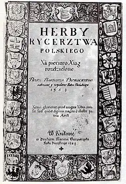 Herby rycerstwa polskiego na pięcioro ksiąg rozdzielone – historia familijna szlachty polskiej ukazana w procesie rozwoju historycznego. Najważniejsze dzieło napisane przez Bartosza Paprockiego[1].