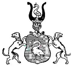 W polu błękitnem – łabędź srebrny z koroną złotą na głowie. Nad hełmem w koronie między dwoma czarnemi rogami łabędż ukoronowany. Tarczę podtrzymują psy w obrożach z głowami odwróconemi w tył[2].