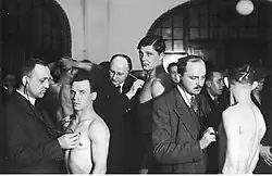 ![]() Lekarz Hieronim Schulz bada przed walką boksera wagi ciężkiej Christowskiego (marzec 1934) | |