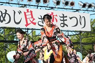 Sierpniowy, niezwykle barwny i energetyczny festyn Himeji Yosakoi Matsuri[3][a][b] jest jednym z elementów kilkudniowego, letniego „karnawału”. Tańce są prezentowane przez zespoły środowiskowe składające się z kilkudziesięciu lub nawet kilkuset uczestników. Każdy zespół dobiera własną muzykę, kostiumy i choreografię. W czasie tańca używa się rekwizytów np.: wachlarzy, parasolek, naruko (rodzaj terkotki, grzechotki, kołatki, prostego narzędzia służącego do przeganiania ptaków z pola). W zależności od regionu festyny noszą różne nazwy, a same parady taneczne i pokazy towarzyszą często innym festiwalom[4].