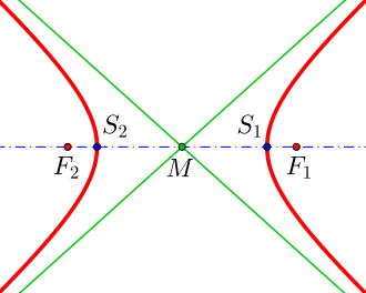 Hiperbola zawsze ma dwie asymptoty; przy powyższym równaniu hiperboli równania asymptot to[1]: