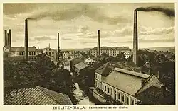 W połowie stulecia zaczyna się równolegle rozwijać przemysł maszynowy i metalowy, w dużej mierze nastawiony na produkcję wyposażenia dla włókiennictwa. Pionierem w tym względzie był Gustav Josephy, który w 1851 założył warsztat naprawy maszyn włókienniczych, rozbudowany z czasem do wielkiej fabryki zaopatrującej większość zakładów tekstylnych w Austro-Węgrzech i Rosji[119]. Kolejnym ważnym przedsiębiorstwem z branży maszynowej był zakład wydzielony w 1876 z warsztatów fabryki włókienniczej Sternickel & Gülcher, od 1884 zarządzany przez Georga Schwabego[120]. Najważniejszą gałęzią pozostało jednak włókiennictwo, które odpowiadało pod koniec XIX wieku za trzy czwarte bielsko-bialskiej produkcji przemysłowej[121]. W 1871 w branży działało 31 fabryk i 290 samodzielnych wytwórców[122], w 1890 liczba fabryk wynosiła 63, a małych producentów 87[123], natomiast spis z 1904 wymienia 92 fabryki, z których największymi, zatrudniającymi około lub ponad 500 pracowników, były: Eduard Zipser & Sohn, Karl Hess, Sternickel & Gülcher oraz J.G. Bathelt[124]. W okręgu bielsko-bialskim produkowano na początku XX wieku około 300 tysięcy sztuk tkanin wełnianych rocznie, co plasowało go w czołówce austriackich ośrodków tekstylnych, obok Brna i Liberca[125].