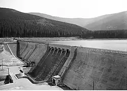 Wielką inwestycją realizowaną przez władze Bielska (w atmosferze kontrowersji dotyczących jej finansowania) była w latach 1929–1932 budowa zapory wodnej w Wapienicy, dzięki której powstał zbiornik Wielka Łąka stanowiący źródło zaopatrzenia miasta w wodę pitną. Przedsięwzięciem samorządowym była też budowa kąpieliska miejskiego przy ulicy Konopnickiej przeprowadzona w 1936[242]. 28 października 1928 na placu Blichowym (obecnie Mickiewicza) w Bielsku odsłonięto pomnik Gabriela Narutowicza. Był to jedyny monument upamiętniający tę postać w międzywojennej Polsce, istniał do 1939[243]. 8 listopada 1927 to początek regularnej miejskiej komunikacji autobusowej. Bielsko-Bialska Spółka Elektryczna i Kolejowa, eksploatująca dotąd tramwaje, uruchomiła pierwsze cztery linie: okrężną po Bielsku i Białej, do Doliny Ludwiki w Wapienicy, do leśniczówki w Lipniku i do sanatorium w Bystrej[244][245]. Rok wcześniej, w maju 1926, zmieniono trasę tramwaju na Żywieckim Przedmieściu, przekładając tory na ulicę Zamkową i Blichową (obecnie Partyzantów)[244]. Niezrealizowane pozostały natomiast plany budowy nowej linii tramwajowej do Białej[246]. W latach 1934–1935 z inicjatywy Ligi Obrony Powietrznej i Przeciwgazowej zbudowano lotnisko sportowe w Aleksandrowicach, stanowiące zaplecze dla założonej w 1936 Szkoły Lotniczej[247].