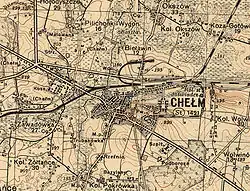 W okresie międzywojennym planowano do Chełma przenieść siedzibę dyrekcji kolejowej (Chełm wygrał konkurencyjną walkę z pobliskim Lublinem). Zaowocowało to rozwojem miasta i budową dzielnicy „Nowe Miasto”[10] na terenach folwarku Obłonie, obejmującej obszar ponad 7-krotnie większy od miasta istniejącego. Pod względem rozmachu inwestycja ta uważana jest za jedną z największych inwestycji II RP (porównywalną z budową Gdyni i Stalowej Woli). Władze miejskie rozpoczęły inwestycję w 1928 r. od budowy sieci nowych ulic według koncepcji rozplanowania nowej dzielnicy z 1926 r., opracowanej przez Spółdzielnię Architektoniczną Pracowników Zakładu Architektury Polskiej Politechniki Warszawskiej pod kierunkiem architektów A. Kuncewicza i A. Paprockiego. Wraz z budową nowych ulic rozpoczęto budowę nowoczesnej sieci wodociągowej i kanalizacyjnej dla całego miasta oraz nowej oczyszczalni ścieków w rejonie ul. Bieławin. Władze miejskie wybudowały własnym sumptem nowoczesny na tamte czasy budynek szkolny zwany „Szkołą-Pomnikiem Dziesięciolecia” Niepodległości Polski (w latach 1928–1930). W lipcu 1928 r. na obszarze ok. 50 ha ruszyła inwestycja PKP obejmująca budowę okazałego gmachu Dyrekcji i 3 kolonii mieszkalnych dla pracowników Wschodniej Dyrekcji Okręgowej Kolei Państwowych (zwanych osiedlami „Dyrekcji”), realizowanych równolegle z budowanymi przez mieszkańców Chełma osiedlami „Domki” i „Działki”. Do wybuchu wojny zrealizowano zasadniczą część sieci nowych ulic, a nowe inwestycje objęły ponad połowę obszaru nowej dzielnicy zaplanowanego w koncepcji rozbudowy miasta z 1926 r. na ponad 430 ha. Chełm stał się ważnym ośrodkiem administracyjnym, (siedziba powiatu chełmskiego-największego w województwie lubelskim oraz miasta wydzielonego na prawach powiatu grodzkiego), oświatowym (jedyną inwestycja oświatową w mieście w okresie międzywojennym było wybudowanie w 1928 roku budynku szkoły Dziesięciolecia[11]), kulturalnym i częściowo gospodarczym (chociaż nie posiadał większych zakładów przemysłowych). Był także miastem garnizonowym dwóch jednostek wojskowych: wspomnianego 7 Pułku Piechoty Legionów i 2 Pułku Artylerii Ciężkiej.