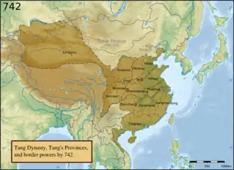 Już za panowania chorowitego syna Taizonga, Gaozonga (649–683), więzi pomiędzy chińskim władcą a Turkami osłabły i w 680 Wschodni Turcy powstali, by utworzyć nowy kaganat. Jednocześnie chińskiej pozycji na zachodzie zaczęło zagrażać imperium tybetańskie, zaś na wschodzie najazdy Kitanów i Balhae. Najważniejszym wydarzeniem panowania Gaozonga był wzrost wpływów jego konkubiny, Wu Zhao (690–705), która po jego śmierci doprowadziła do detronizacji swojego syna i w 690 objęła tron jako jedyna w historii Chin kobieta. Powołana przez nią Dynastia Zhou nie przetrwała jednak jej śmierci i Tangowie powrócili do władzy. Za ostatni okres pomyślności dynastii uznaje się długie panowanie Xuanzonga (712–756), które jednak skończyło się katastrofą. Armia Tangów początkowo opierała się głównie na rodzimych oddziałach fubing, ale stopniowo zastępowano ich barbarzyńskimi najemnikami. Jednocześnie za czasów Xuanzonga by wzmocnić obronę granic ustanowiono szereg „wojskowych namiestnictw” (jiedushi), które zaczęły być obsadzane przez zawodowych wojskowych niechińskiego pochodzenia. W 756 jeden z nich, An Lushan, wszczął bunt, stłumiony jedynie po uprzednim dwukrotnym splądrowaniu stolicy i szeregu koncesji na rzecz Kaganatu Ujgurów oraz de facto niezależnych namiestników, bez ich wsparcia pokonanie rebeliantów byłoby bowiem niemożliwe[108][109].