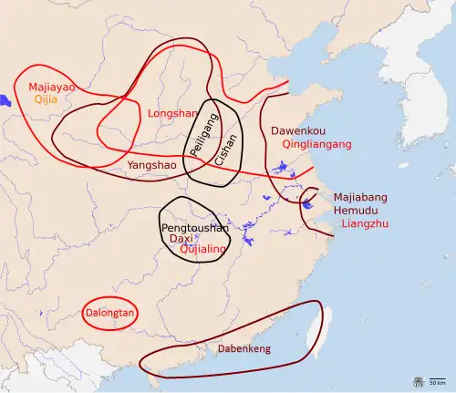 Przyjmuje się, że na terenie Chin neolit rozpoczął się ok. 8500 lat temu, jednak procesy, które doprowadziły do powstania rolnictwa i przejścia do osiadłej formy życia sięgają 20 tys. lat wstecz. Chiny są jednym z kilku miejsc na Ziemi, gdzie rolnictwo rozwinęło się niezależnie i z którego rozprzestrzeniało się na inne tereny. Jednocześnie jednak jest jedynym z miejsc tego rodzaju, w przypadku którego jak dotąd nie udało się zrekonstruować pełnej trajektorii przejścia od społeczeństw łowiecko-zbierackich do rolniczych. Wśród uczonych nie ma nawet zgody co do hipotez: jednego procesu przejścia do rolnictwa obejmującym Północ (basen Huang He i Wei) i Centralne Chiny (basen środkowej i dolnej Jangcy) (D.J. Cohen), dwoma lub trzema centrami na Północy, w basenie Jangcy i na tropikalnym Południu (L. Liu, Z. Zhao) czy wielością centrów (G. Schelach)[2].