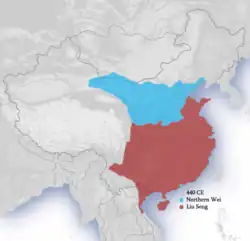 Przez większość tego okresu Chiny były podzielone na dwa cesarstwa, panujące na Północy i Południu. Południe było rządzone z Jiankangu przez kolejne dynastie Song (420-479), Qi (479-502), Liang (502-557) i Chen (557-589). W tym czasie nad Północą panowała Północna dynastia Wei (386-535), która w 535 rozpadła się na dwa cesarstwa, wschodnie i zachodnie. Podczas gdy Południe było rządzone przez dynastie chińskiego pochodzenia, to na Północy panowali stopniowo coraz bardziej zsinizowani Xianbei, przy czym stulecia mieszanych małżeństw i współpracy ze sobą doprowadziły ostatecznie do powstania mieszanej, chińsko-xianbei'jskiej elity, która miała rządzić w państwach powstałych po upadku Północnej dynastii Wei i dać początek kolejnym cesarskim dynastiom, Sui i Tang[86].
