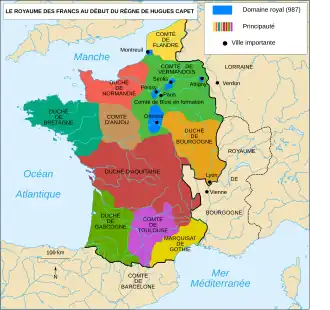 W 987 r. królem wybrano Hugona Kapeta, założyciela panującej we Francji do 1328 r. dynastii Kapetyngów. W 1328 r. królem Francji wybrano Filipa VI, pierwszego przedstawiciela panującej do 1589 r. dynastii Walezjuszów (boczna linia Kapetyngów). Rozpoczęta w 1337 r. i zakończona w 1453 r. wojna stuletnia z Anglią toczyła się z przerwami i ze zmiennym szczęściem głównie na terenie Francji, pustosząc jej obszary. Ostatecznie, w wyniku m.in. działalności Joanny d’Arc (1429), Francja wyszła zwycięsko ze zmagań, co przyśpieszyło proces kształtowania się scentralizowanej monarchii francuskiej. W drugiej połowie XV w., pod rządami Ludwika XI, nastąpiło pełne zjednoczenie ziem francuskich.
