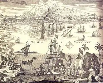 W 1654 roku Oliver Cromwell wysłał dwie ekspedycje okrętów wojennych, w kierunku Hispanioli celem zdobycia bazy wypadowej na Karaiby, oraz Gibraltaru pod pozorem obrony wybrzeża przed atakami piratów berberyjskich. Anglikom nie udało się zdobyć Hispanioli, ale w maju 1654 roku przejęli kontrolę nad Jamajką. Druga flota zakotwiczyła w okolicach Kadyksu i bez sukcesu próbowała przejąć statki płynące z hiszpańskich kolonii. Wraz z nastaniem zimy, wojska zostały zawrócone do Anglii[21]. W 1693 roku podczas Wojny Dziewięcioletniej, w której Anglia i Hiszpania były sojusznikami, resztki sił angielsko-holenderskich którym dowodził George Rooke, schroniły się w mieście po przegranej bitwie w Zatoce Lagos. Jedenaście lat później Rooke powrócił na Gibraltar aby go zdobyć[13].