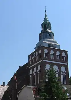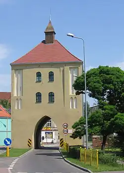Pod koniec XIII w. rozpoczęto budowę ceglanego kościoła mariackiego o trzech nawach, a w 1300 r. budowę murów obronnych otaczających miasto[36]. Łączna ich długość sięgnęła 650 m a rozpiętość od 200–350 m. Fortyfikacje miasta zostały wzbogacone o 3 bramy (Wysoką z przedbramiem, Kamienną i Regi z barbakanem), 3 wieże strzelnicze (Prochową, Mostową i Młyńską), liczne baszty oraz fosę[37]. Rada miejska składała się od 9 do 12 radnych. Co roku w dzień św. Michała (29 września) zmieniano 1/3 rady. Władze przejęły niższe sądownictwo[38]. W roku 1316 i 1357 miasto zawierało przymierza przeciwko rabusiom, którzy prowadzili rozboje, plądrowali i napadali na okoliczne miejscowości. Przymierza te przywróciły normalizację życia i rozwoju gospodarczego[39].