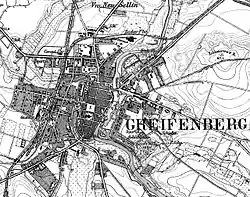 Dopiero przełom XIX i XX wieku przyniósł dalszy rozwój gospodarczy miasta, na którego terenie wybudowano cukrownię, fabrykę wyrobów ceramicznych i pieców, krochmalnię oraz fabrykę marmolady. W 1882 r. Gryfice uzyskały połączenie kolejowe dzięki budowie linii Dąbie – Kołobrzeg, ułatwiające znacznie transport płodów rolnych do większych miast i portów, a w 1896 r. zakończono budowę pierwszej wąskotorowej linii kolejowej przez Popiele do Niechorza. 2 lata później otwarto linię do Dargosławia przez Tąpadły. W 1901 r. nowo zbudowana linia połączyła Gryfice z Golczewem, a w 1913 r. uruchomiono kolej do Kołomącia[97]. Obie linie miały rozstaw szyn 750 mm, który w 1900 r. zmieniono na 1000 mm. W 1911 r. oddano do użytku most żelbetowy, łączący śródmieście z prawobrzeżem miasta.