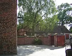Na południe od Bramy Lubawskiej przy murach w kierunku kościoła znajdował się dwór urzędników krzyżackich. Przypuszczalnie dochodził on do wieży kościoła, z którym łączyło go przejście na wysokości pierwszego piętra. Budynek ten prócz siedziby dla urzędnika, posiadał izbę reprezentacyjną („izba komtura”), piwnice i strych oraz zabudowania gospodarcze. Piwnice i strych pełniły rolę składu, znajdowały się tam beczki z piwem (w 1438 r. 10 beczek piwa miejscowego i 1 gdańskiego), solą oraz zboże i inne przedmioty jak wanny, kany itp. W zabudowaniach gospodarczych znajdowały się zwierzęta hodowlane, np. w 1397 r. – 9 krów, 29 owiec, 7 świń i 2 konie. Dane liczbowe świadczą, że rzeczywiście był to niewielki rozmiarami zespół budowlany, choć od początku murowany, wyróżniał się wraz z kościołem od innych budynków w mieście. Najpewniej dwór ten posiadał kształt czworoboku o skrzydłach południowym i północnym, względem siebie równoległych. Dachy sięgające prezbiterium kościoła były strome, dwuspadowe. Ponadto całość uzupełniał dziedziniec oraz prawdopodobnie osobne wejście przez mury.