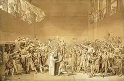 Kiedy w 1789 r. sytuacja finansowa kraju stała się krytyczna, Ludwik XVI zwołał (po raz pierwszy od 1614 r.) Stany Generalne, które miały zająć się sytuacją ekonomiczna i przegłosować nowe podatki. Stany Generalne, które uroczyście otwarto w Wersalu 5 maja 1789 r., były zgromadzeniem ustawodawczym społeczeństwa, w którym zasiadali przedstawiciele trzech stanów społecznych: duchowieństwa, szlachty i „trzeciego stanu”, czyli reszty społeczeństwa, stanowiącej 97% ludności, pozbawionej przywilejów i ponoszącej główny ciężar finansowy utrzymania państwa w postaci płaconych podatków. Na swoje żądanie trzeci stan otrzymał podwójną reprezentację (578 przedstawicieli wobec 270 ze szlachty i 291 z duchowieństwa); na mocy dekretu królewskiego w głosowaniach nadal miała jednak obowiązywać zasada, że głosują całe stany, a nie poszczególni posłowie. Ponieważ każdy stan miał jeden głos, w praktyce oznaczało to, że stan trzeci będzie zawsze mógł być przegłosowany przez dwa pozostałe. Sytuacja potoczyła jednak się w innym, nieoczekiwanym, kierunku. Już pierwszy punkt obrad (ustalenie zakresu władzy zgromadzenia) doprowadził do impasu. Zamiast spotkać się w jednej sali i dyskutować nad nowymi podatkami, stany zaczęły obradować osobno, dyskutując na temat organizacji władzy ustawodawczej. Wreszcie 17 czerwca wobec niemożności dojścia do porozumienia trzeci stan przekształcił się w Zgromadzenie Narodowe (nie wykluczono możliwości przystąpienia do niego pozostałych stanów). Kiedy król, próbując oponować, zamknął Salle des États, w którym spotykało się zgromadzenie, posłowie przenieśli się do sali do gry w piłkę[19] w wersalskim pałacu, gdzie 20 czerwca złożyli przysięgę, że nie rozejdą się, dopóki nie uchwalą konstytucji Francji. Po dwóch dniach Zgromadzenie przeniosło się do kościoła św. Ludwika, gdzie przystąpiła do niego większość przedstawicieli stanu duchowieństwa, później również szlachty. 9 lipca Zgromadzenie oficjalnie przekształciło się w Konstytuantę, której oficjalnym celem było opracowanie konstytucji.