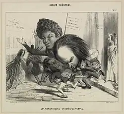 - ↑ Karykatura autorstwa de Barray przedstawia Victora Hugo, Aleksandra Dumasa i Frédéricka Lemaître, wypędzanych ze „świątyni teatru” Comédie-Française przez grającą w klasycystycznych dramatach aktorkę Rachel Félix. Patrz interpretacja karykatury na stronie (fr.).