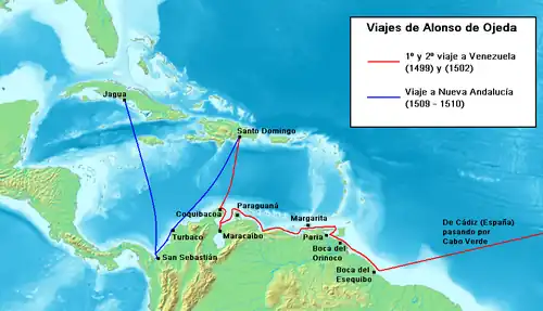 Alonso de Hojeda powrócił na tereny dzisiejszej Wenezueli w 1502, po uzyskaniu poparcia władców Hiszpanii. Wyprawa de Hojedy dopłynęła najpierw do wenezuelskiej wyspy Margarita, gdzie zdobyła trochę złota. Następnie po przepłynięciu przez wenezuelskie wybrzeże udała się na półwysep Guajira, gdzie na terytorium dzisiejszej Kolumbii tuż nad granicą z Wenezuelą założyła osadę Santa Cruz, która zdołała się bronić przed tubylcami trzy miesiące. W tym samym roku Hiszpania założyła na terenie współczesnej Wenezueli miasto Cumaná.