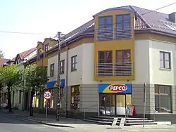 W architekturze miasta, prócz galerii handlowej przy ul. Wojska Polskiego, wielkopowierzchniowych dyskontów spożywczych (ul. J. Dąbskiego, 3 Maja, Sportowa) i innych tego typu obiektów – można odnaleźć pojedyncze, małe budynki handlowe (np. przy ul. J. Dąbskiego) bądź w zabudowie szeregowej (os. XXX-lecia PRL (ul. Akacjowa), ul. Wałowa, Kościelna i Bracka) – parterowe i piętrowe wykończone płaskim, pulpitowym, dwu i wielospadowym dachem oraz wejściem z witryną sklepową. Niektóre piętrowe są przystosowane pod zamieszkanie lub wynajem pod biura (np. ul. Wałowa).