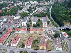 W 1814 r. przebudowano dotychczasowy drewniany most łączący śródmieście z prawobrzeżem miasta. Przyczółki zostały wzmocnione kamieniami, zbudowano również kamienne podpory[39]. W 1815 r. w wyniku zawalenia się jednej ze ścian nośnych – ratusz rozebrano i później wybudowano nowy przy ul. Niepodległości, przyległej od zachodu do placu Zwycięstwa. W XIX w. rynek został wybrukowany. W centralnej części placu usytuowano pomnik z brązu ku czci cesarza Wilhelma I (1896 r.) Posadzono pierwsze drzewa (w latach 30. XX w. obsadzony był już cały plac). Ulice oświetlono najpierw gazowymi, a następnie elektrycznymi latarniami. Na licznych fotografiach ukazujących zabudowę pierzei przyrynkowej z końca XIX w. widoczne są wyraźnie tradycyjne formy fasad, względem ulic ustawione kalenicowo i szczytowo. Domy były częściowo podpiwniczone, jedno- i dwupiętrowe z mieszkalnym poddaszem. Za nimi często sytuowano małe budynki gospodarcze o małych oknach i pulpitowym dachu[18][21]. Tylko nieliczni mieszkańcy budowali swoje wille z ogrodami na obrzeżach miasta. Budownictwo zostało poszerzone w kierunkach: zachodnim i północnym. W latach 1861–1885 ilość budynków mieszkalnych wynosiła ok. 500. (w 1627 r. – 320, 1718 r. – 246, 1822 r. – 385, a w 1861 r. – 444[40])