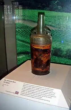 Sztuka wytwarzania szklanych butelek była powszechnie znana w starożytnym świecie, jednak rozwinęli i upowszechnili ją Syryjczycy[20], a potem Rzymianie. Szkło nie było dobrym materiałem do przechowywania i transportowania wina[21], używano w tym celu glinianych amfor lub drewnianych beczek[22]; po upadku cesarstwa rzymskiego już prawie wyłącznie beczek[23]. Mocna butelka zamykana korkiem, mogąca wytrzymać ciśnienie CO