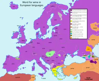 Wyraz wino pochodzi prawdopodobnie z łaciny, starożytni Rzymianie nazywali ten płyn vinum[1]. Łacińskie vinum z kolei może pochodzić z greki (gdzie wino nazywa się οἶνος oînos, w wymowie archaicznej ϝοῖνος woînos)[1][2]. Istnieją teorie wskazujące na pierwotne źródło w sanskrycie (vena – odurzający sok z nieznanej rośliny) albo języku Hetytów (określenie wina transkrybowane na we-anas)[1].