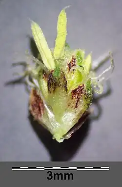 - Zebrane w kłoski, te z kolei zebrane w kuliste główki. Główka środkowa siedząca, o średnicy 8–12 mm. Główki boczne mniejsze, na szypułkach. Podsadka liściowata, cienka. Przysadki małe, odwrotnie jajowate, z frędzelkami na brzegu. Cztery lub pięć szczecin okwiatu[6].