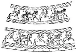 Do rydwanu zaprzęgano zwykle dwa konie. Czasami powożącego przedstawiano trzymającego cztery cugle, co mogło sugerować, że powóz bojowy był ciągnięty przez cztery konie. W rzeczywistości jednak maksymalnie do rydwanu zaprzęgano trzy konie, o czym świadczy istnienie bocznego ciągu, łączącego jednego dodatkowego konia bezpośrednio z wozem. W rydwanie mieściły się dwie osoby – woźnica i wojownik[12].